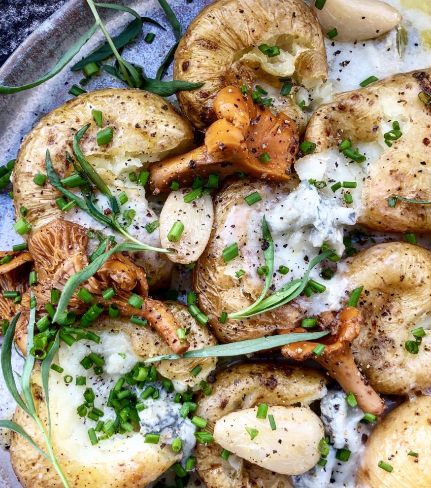 Fancy Baked Potatoes Recipe (with Gorgonzola, pickled chanterelles and confit garlic)
